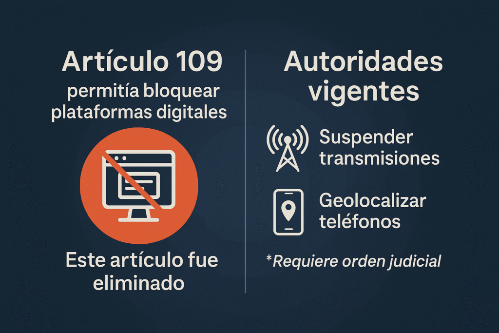 Originalmente contenía el artículo 109, que facultaba a la Agencia a bloquear plataformas digitales, pero este artículo fue eliminado tras críticas por restringir la libertad en línea (agendatlaxcala.com, 29 de junio de 2025). Sin embargo, se mantiene la facultad de suspender transmisiones en caso de violaciones a los derechos de audiencia, así como la autorización para geolocalizar teléfonos móviles en tiempo real, aunque supuestamente requiere orden judicial (eluniversal.com, 29 de junio de 2025).